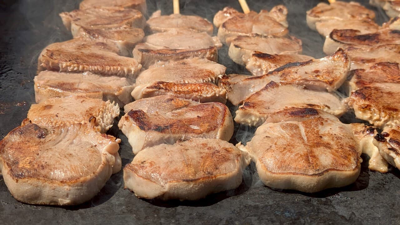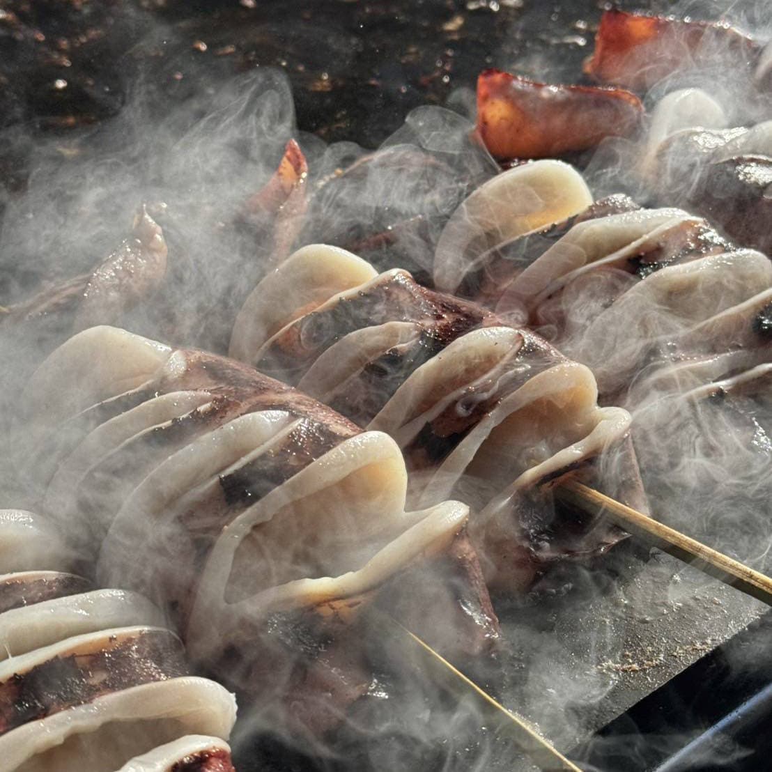 直径46センチの肉厚ジューシーなジャンボロースステーキ串。秘伝のタレに漬け込み炭火で焼き上げます。仕上に能登のオリジナルの塩田の塩を振りかけます。金沢の味を是非ご賞味ください。