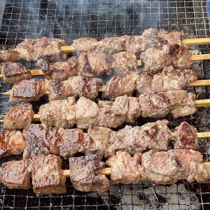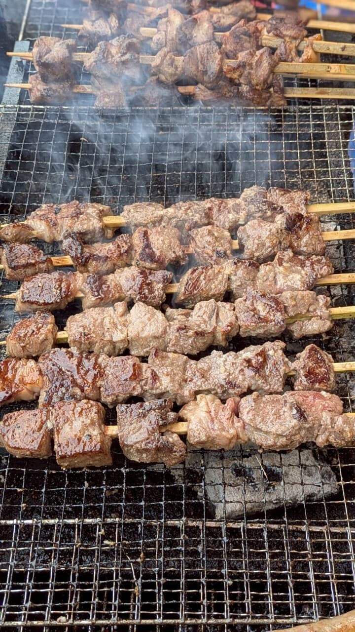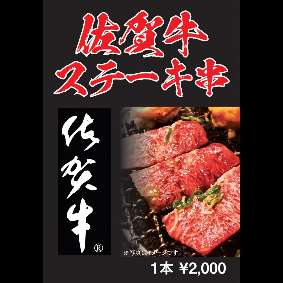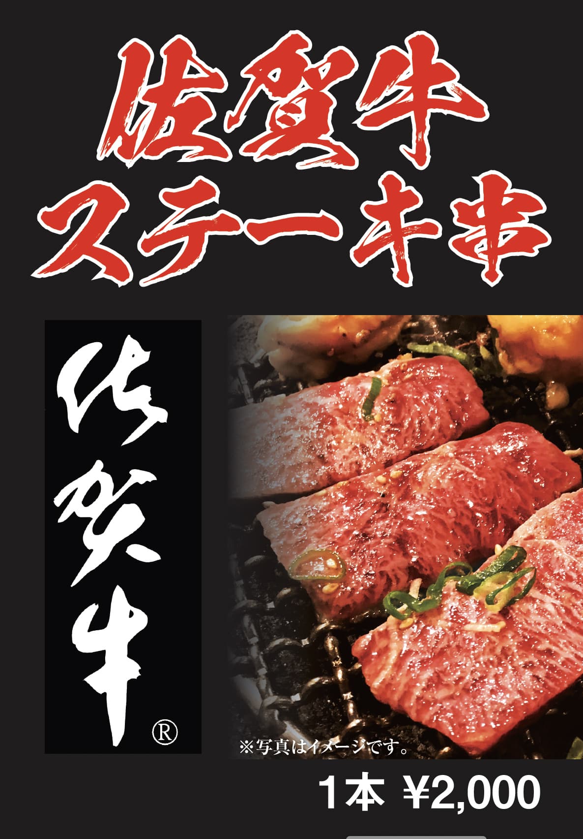 直径46センチの肉厚ジューシーなジャンボロースステーキ串。秘伝のタレに漬け込み炭火で焼き上げます。仕上に能登のオリジナルの塩田の塩を振りかけます。金沢の味を是非ご賞味ください。