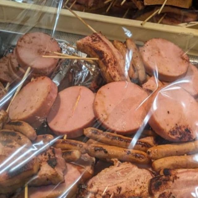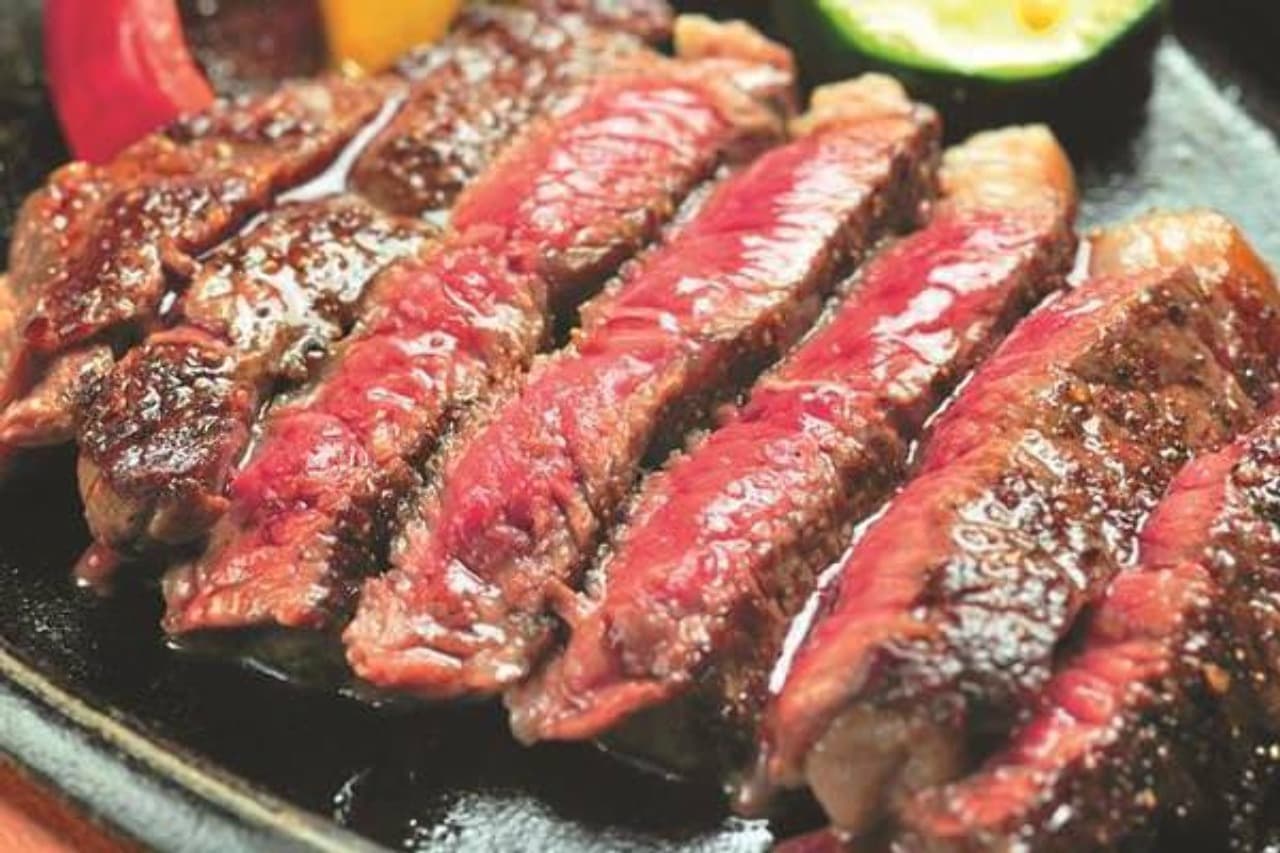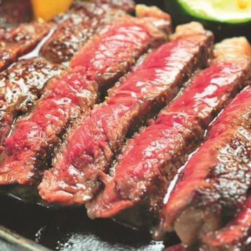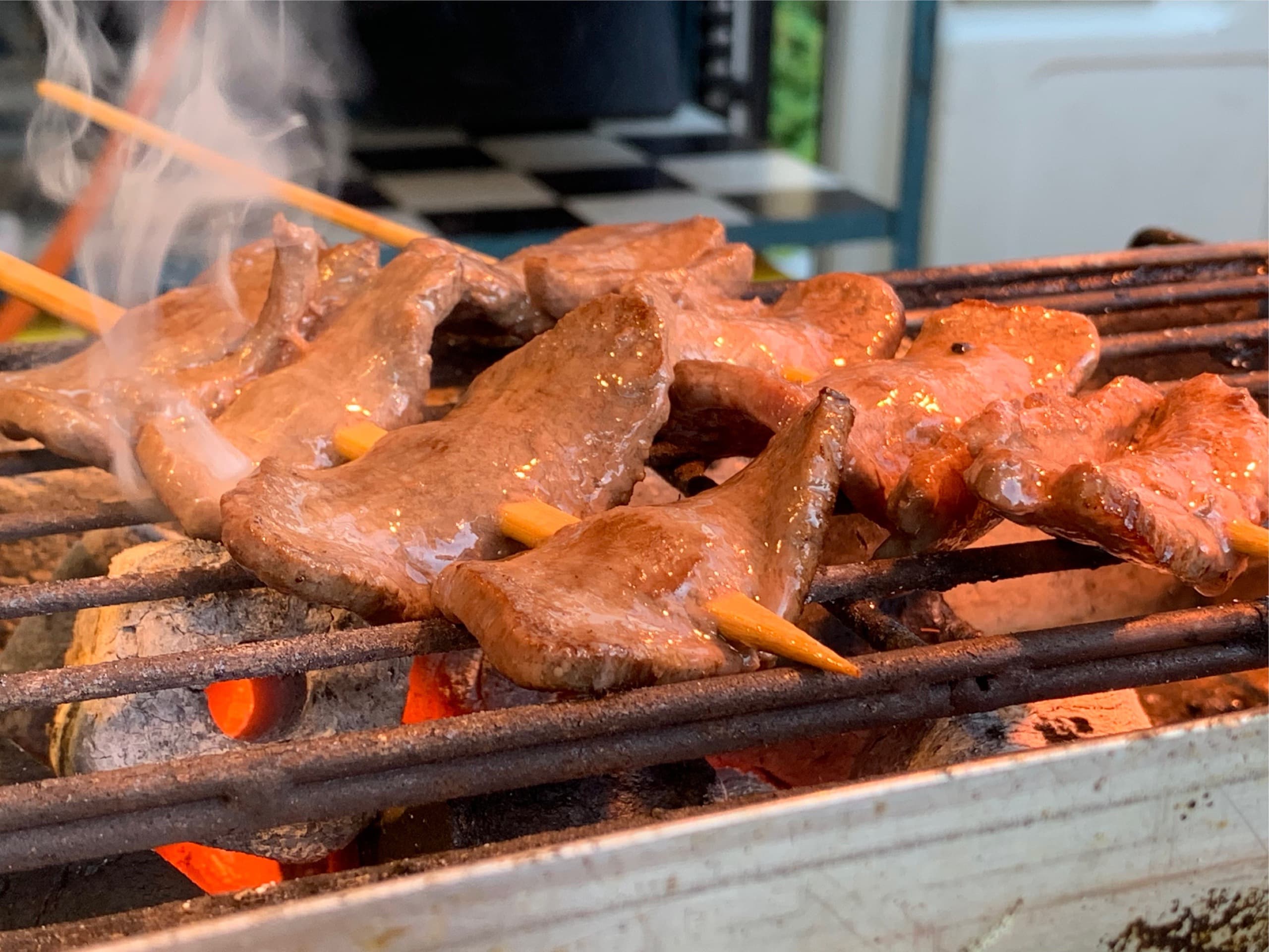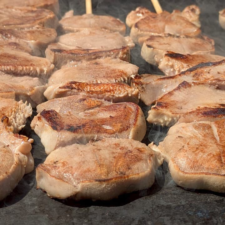 直径46センチの肉厚ジューシーなジャンボロースステーキ串。秘伝のタレに漬け込み炭火で焼き上げます。仕上に能登のオリジナルの塩田の塩を振りかけます。金沢の味を是非ご賞味ください。