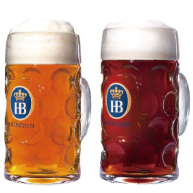 (右)ホフブロイドゥンケル:ほのかなキャラメル香、口当たりまろやか。ダークブラウンの色合いが特徴的です。